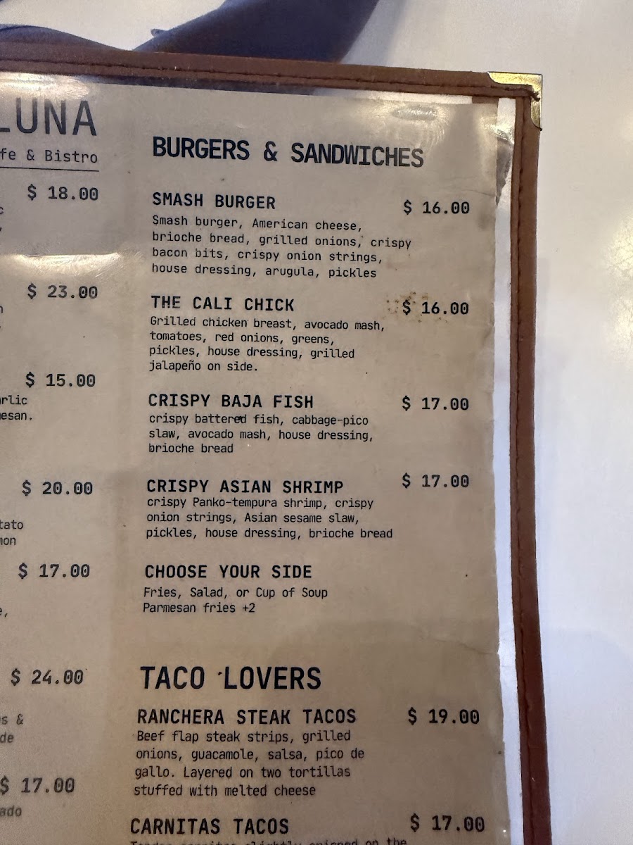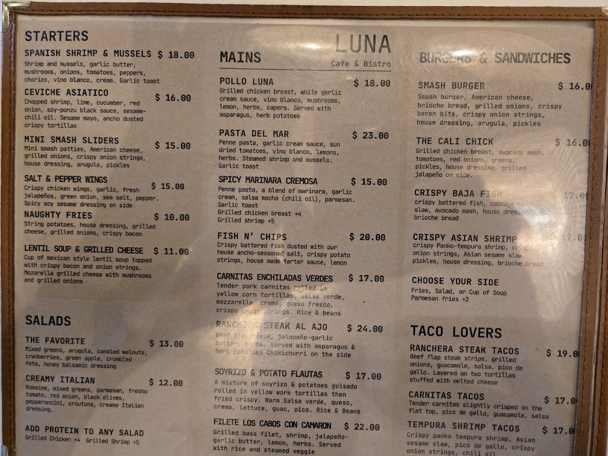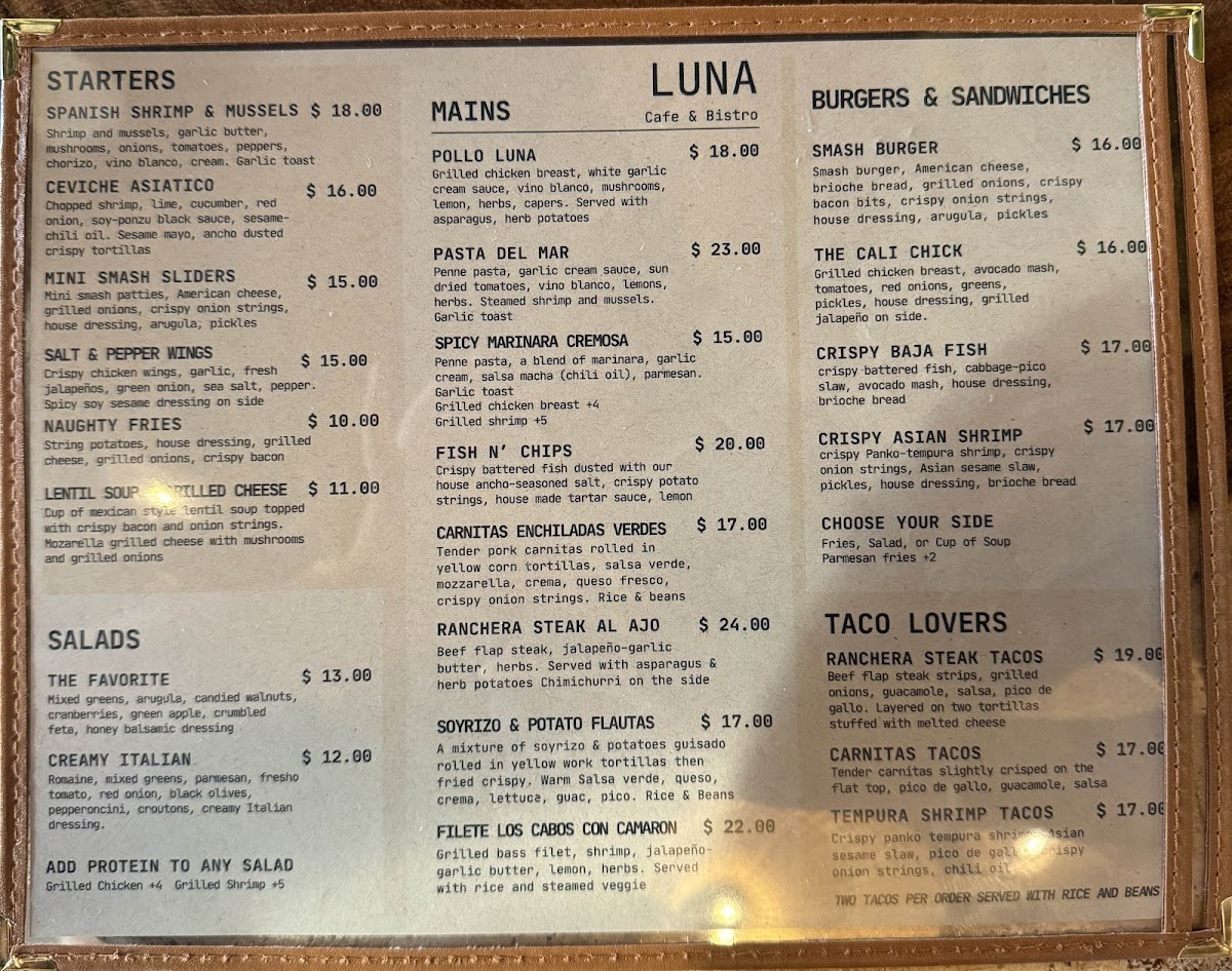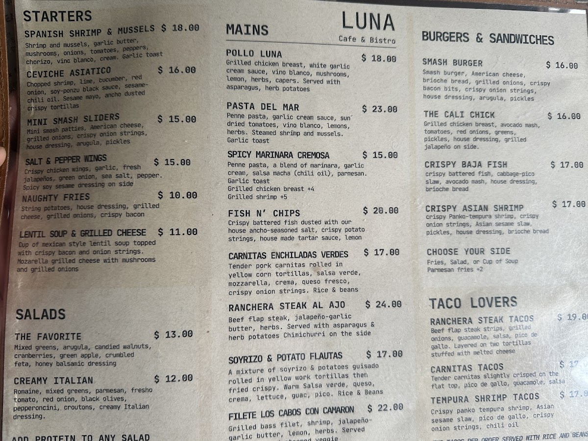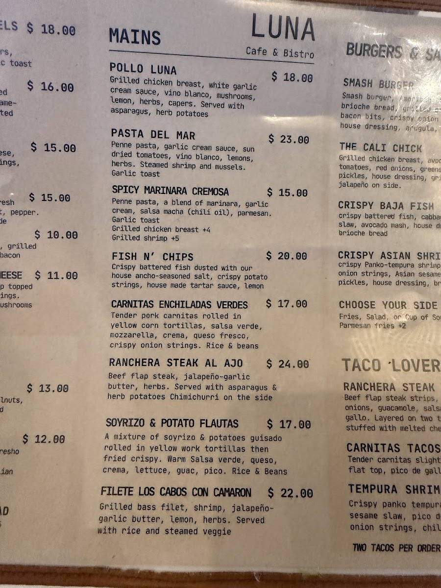 Welcome to LUNA Bistro & Cafe, a charming culinary gem located at 1230 H St, Bakersfield. This vibrant eatery offers a delightful menu that caters to every palate, from health-conscious diners to taco enthusiasts. Indulge in refreshing salads like the Creamy Italian Romaine or The Favorite, bursting with unique flavors and textures. For taco lovers, the Baja Fish Tacos and Shrimp Gobernador Verdes deliver tantalizing tastes reminiscent of a beachfront escape.